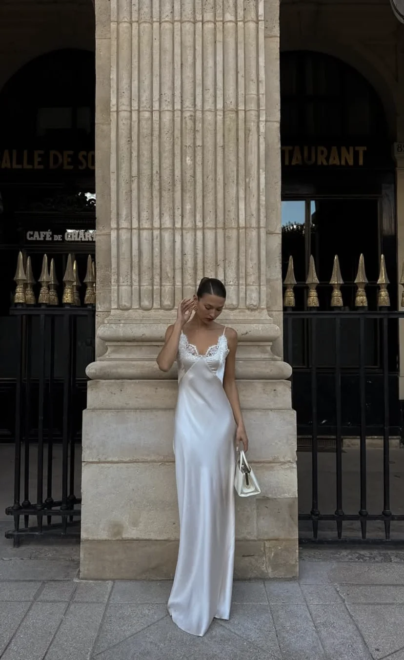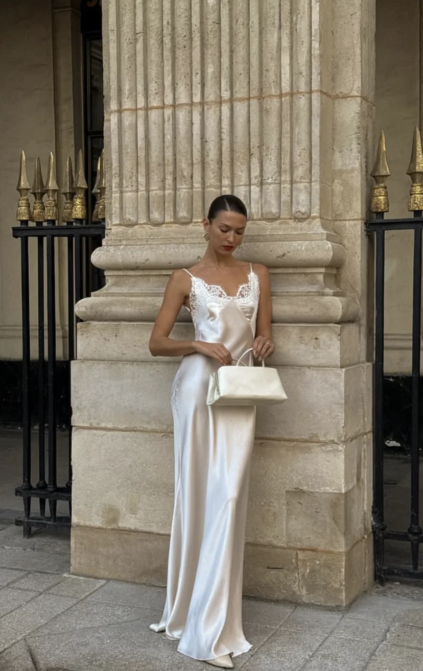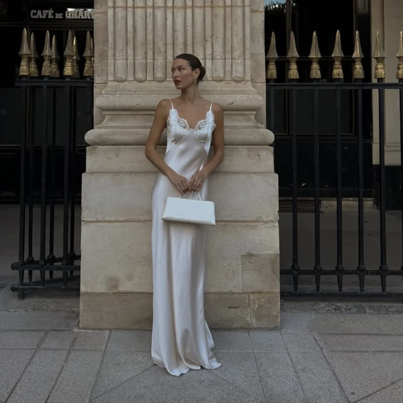 OEM Wholesale White Satin Backless Spaghetti Strap Lace Maxi Dress Elegant V-Neck Slip Dress for Wedding Evening Party